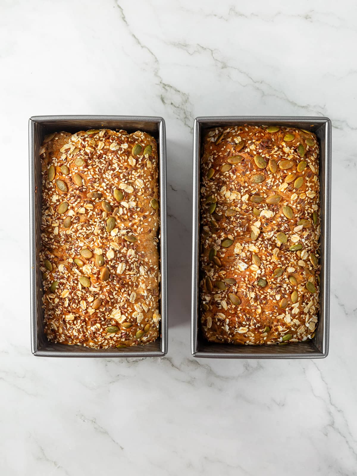 The photos helped me relax while making this, since the dough doesn’t puff up like white breads. My loaves still baked up hearty and sliceable, and I’m obsessed with that seed crunch!