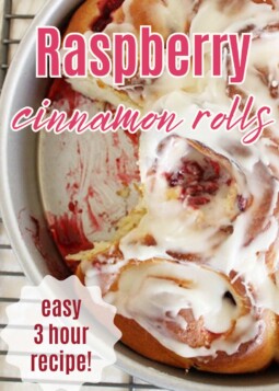 To transform this recipe into overnight raspberry cinnamon rolls, simply refrigerate the dough after placing the rolled and sliced dough into the pan. I would recommend using fresh raspberries for this method or you can precook the filling into a jam like I do in my strawberry cinnamon rolls. Cool before assembling.